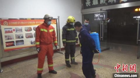 捕捉蝙蝠歸隊(duì)之后,所有消防員都接受殺菌消毒。 周洋 攝 同日21時(shí)許,一只蝙蝠飛行中撞在了靈石縣新建街一戶居民的紗窗門上無法動(dòng)彈。因擔(dān)心蝙蝠攜帶病毒較多,居民不敢處置,當(dāng)即報(bào)警求助。