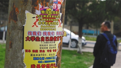 張貼在鄭州一大學(xué)校園內(nèi)的校園網(wǎng)貸廣告。新京報記者 曹曉波 攝