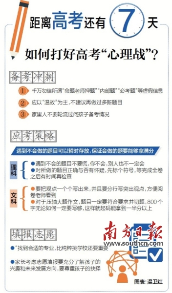 張敏強(qiáng)不忘囑咐家長(zhǎng),要?jiǎng)?chuàng)造寬松、良好的環(huán)境,讓考生輕松上陣。“一定要讓孩子休息好,補(bǔ)品不要吃太多,家里其他的人,不要每個(gè)人都過(guò)問(wèn)?!彼€提醒,所有的高考用具,要備份一套。