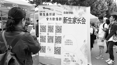 9月1日,中央財經(jīng)大學(xué)新生報到現(xiàn)場,金融學(xué)院的學(xué)生邀請新生掃碼入群。李涓 攝