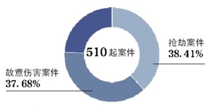 廣東省檢察機(jī)關(guān)2013年至2015年受理移送審查起訴校園暴力案件,510起案件中,搶劫、故意傷害案件分別占38.41%及37.68%
