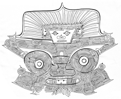 這是一幅良渚遺址中玉琮上的神徽考古繪圖:良渚遺址以其出土的大量精美玉器而聞名海內(nèi)外。被世人熟知的“琮王”上刻有8組精致的神人獸面圖案——神人佩戴介字形冠帽,聳肩、平臂彎肘、五指平張位于獸面大眼斜上側(cè),每組神像大小僅3厘米×4厘米。