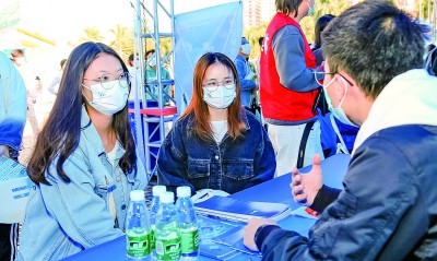 2021年珠海舉辦的“粵港澳大灣區(qū)大學生就業(yè)實習雙選會”上,學生與參會企業(yè)代表交流。新華社發(fā)