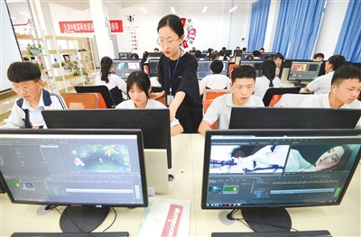 河北省邯鄲市涉縣職業(yè)教育中心數(shù)字媒體專業(yè)學生在老師指導下學習影視后期剪輯。郝群英攝(新華社發(fā))