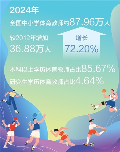 近年來,我國中小學體育教師隊伍不斷壯大。2024年全國中小學體育教師約87.96萬人,較2012年增加36.88萬人,增長72.20%。特別是近5年,全國體育教師數(shù)量增速明顯,師資補充力度加大。