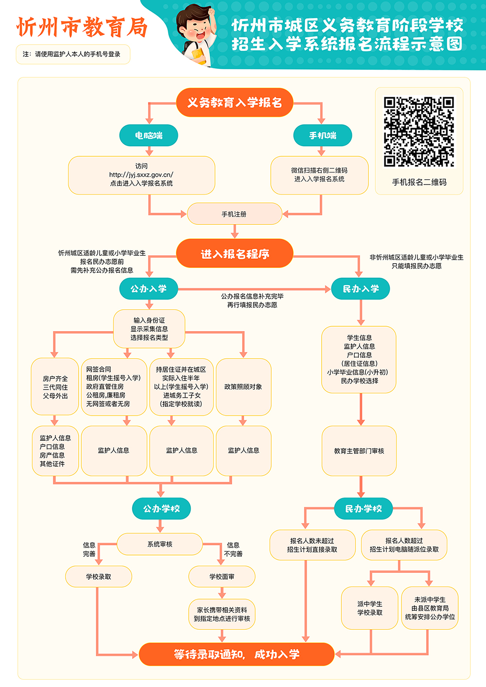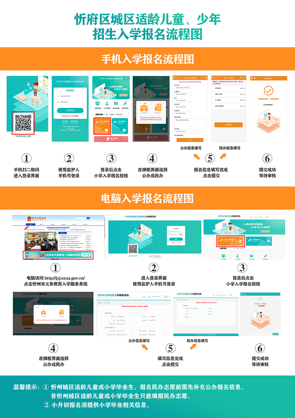忻州市城區(qū)義務(wù)教育階段學校招生入學系統(tǒng)報名流程示意圖