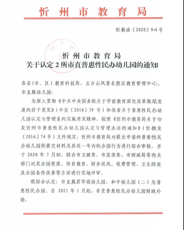 忻州市教育局關于認定2所市直普惠性民辦幼兒園的通知