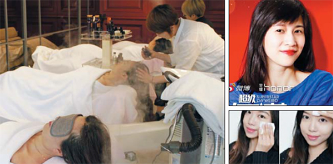 今年3月,在首爾新沙洞林蔭道,中國(guó)“網(wǎng)紅”們正在接受愛茉莉太平洋用韓方洗發(fā)水產(chǎn)品進(jìn)行的頭皮護(hù)理。右上方的圖片,是papi醬上月16日在上海進(jìn)行的粉絲見面會(huì)海報(bào)。下方的圖片是“網(wǎng)紅”周倩晗今年3月在自己微博上發(fā)布的韓國(guó)化妝品體驗(yàn)后記。