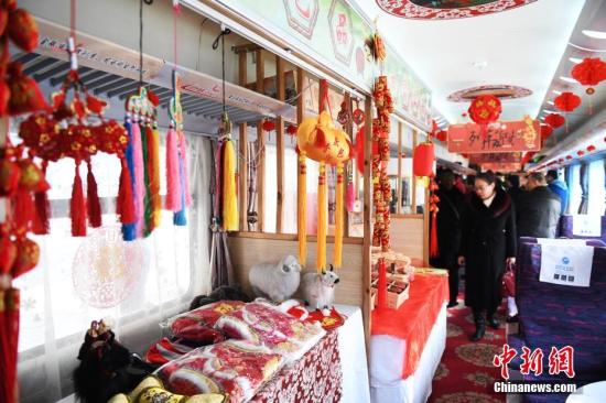 1月13日,春運首日,蘭州鐵路局蘭州客運段擔(dān)當(dāng)?shù)腪6207次列車上設(shè)立“年貨超市”吸引旅客。中新社記者 楊艷敏 攝