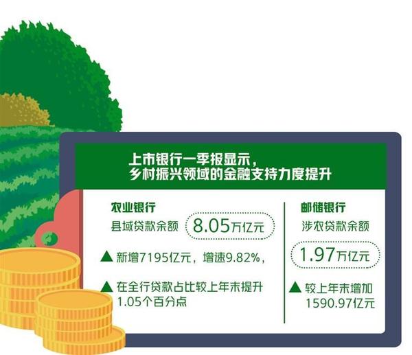 近日,各家上市銀行一季報(bào)先后披露完畢。從公開(kāi)數(shù)據(jù)看,中國(guó)農(nóng)業(yè)銀行、中國(guó)郵政儲(chǔ)蓄銀行等在鄉(xiāng)村振興領(lǐng)域的金融支持力度持續(xù)提升。其中,農(nóng)業(yè)銀行縣域貸款余額達(dá)8.05萬(wàn)億元,新增7195億元,增速9.82%,增量創(chuàng)歷史同期新高,在全行貸款占比較上年末提升1.05個(gè)百分點(diǎn)。郵儲(chǔ)銀行涉農(nóng)貸款余額1.97萬(wàn)億元,較上年末增加1590.97億元;建成信用村38.69萬(wàn)個(gè),評(píng)定信用戶(hù)超千萬(wàn)戶(hù),主動(dòng)授信白名單客戶(hù)貸款本年凈增366.20億元。