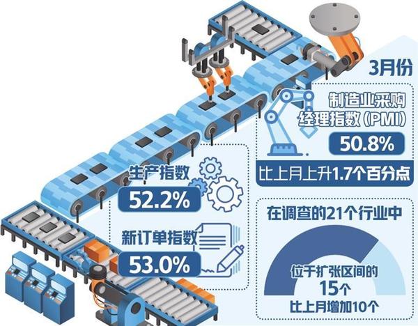 國家統(tǒng)計局服務(wù)業(yè)調(diào)查中心、中國物流與采購聯(lián)合會3月31日發(fā)布的中國采購經(jīng)理指數(shù)顯示,3月份,制造業(yè)采購經(jīng)理指數(shù)、非制造業(yè)商務(wù)活動指數(shù)和綜合PMI產(chǎn)出指數(shù)分別為50.8%、53.0%和52.7%,分別比上月上升1.7個、1.6個和1.8個百分點,三大指數(shù)均位于擴(kuò)張區(qū)間,企業(yè)生產(chǎn)經(jīng)營活動加快,我國經(jīng)濟(jì)景氣水平回升。