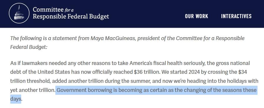 聯(lián)邦預(yù)算問責(zé)委員會(huì)主席馬婭·麥吉尼亞斯在發(fā)言稿中直言:“如今,美國(guó)政府借款正變得像季節(jié)的變化一樣規(guī)律而確定?!?/p>