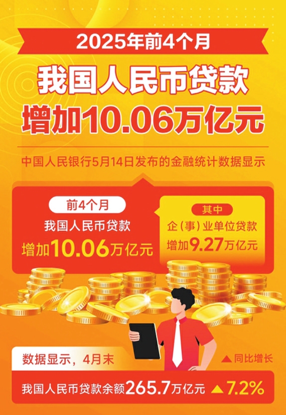 中國(guó)人民銀行當(dāng)日發(fā)布的金融統(tǒng)計(jì)數(shù)據(jù)顯示,4月末,我國(guó)人民幣貸款余額265.7萬億元,同比增長(zhǎng)7.2%;社會(huì)融資規(guī)模存量為424萬億元,同比增長(zhǎng)8.7%;廣義貨幣(M2)余額325.17萬億元,同比增長(zhǎng)8%。