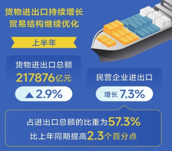 貨物進(jìn)出口持續(xù)增長(zhǎng),貿(mào)易結(jié)構(gòu)繼續(xù)優(yōu)化。上半年,貨物進(jìn)出口總額217876億元,同比增長(zhǎng)2.9%。民營(yíng)企業(yè)進(jìn)出口增長(zhǎng)7.3%,占進(jìn)出口總額的比重為57.3%,比上年同期提高2.3個(gè)百分點(diǎn)。