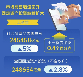 市場(chǎng)銷售增速回升,固定資產(chǎn)投資繼續(xù)擴(kuò)大。上半年,社會(huì)消費(fèi)品零售總額245458億元,同比增長(zhǎng)5%,比一季度加快0.4個(gè)百分點(diǎn)。全國(guó)固定資產(chǎn)投資(不含農(nóng)戶)248654億元,同比增長(zhǎng)2.8%;扣除房地產(chǎn)開(kāi)發(fā)投資,全國(guó)固定資產(chǎn)投資增長(zhǎng)6.6%。