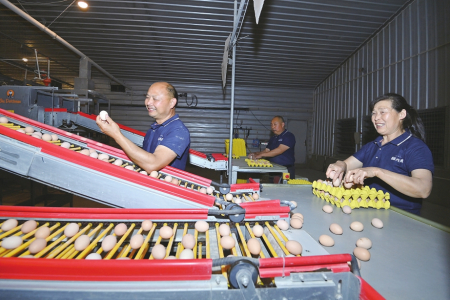 雞蛋通過(guò)自動(dòng)分級(jí)機(jī)流向預(yù)先設(shè)定規(guī)格標(biāo)準(zhǔn)的生產(chǎn)線,工作人員再將大小一致的雞蛋收集碼盤。