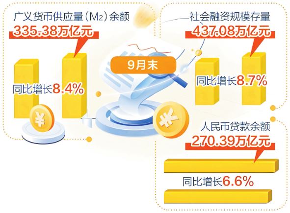 9月末,M2余額335.38萬億元,同比增長(zhǎng)8.4%,在上年同期高基數(shù)背景下,仍保持較高增速;社會(huì)融資規(guī)模存量437.08萬億元,同比增長(zhǎng)8.7%,比上年同期高0.7個(gè)百分點(diǎn);前三季度,社會(huì)融資規(guī)模增量累計(jì)為30.09萬億元,同比多增4.42萬億元。