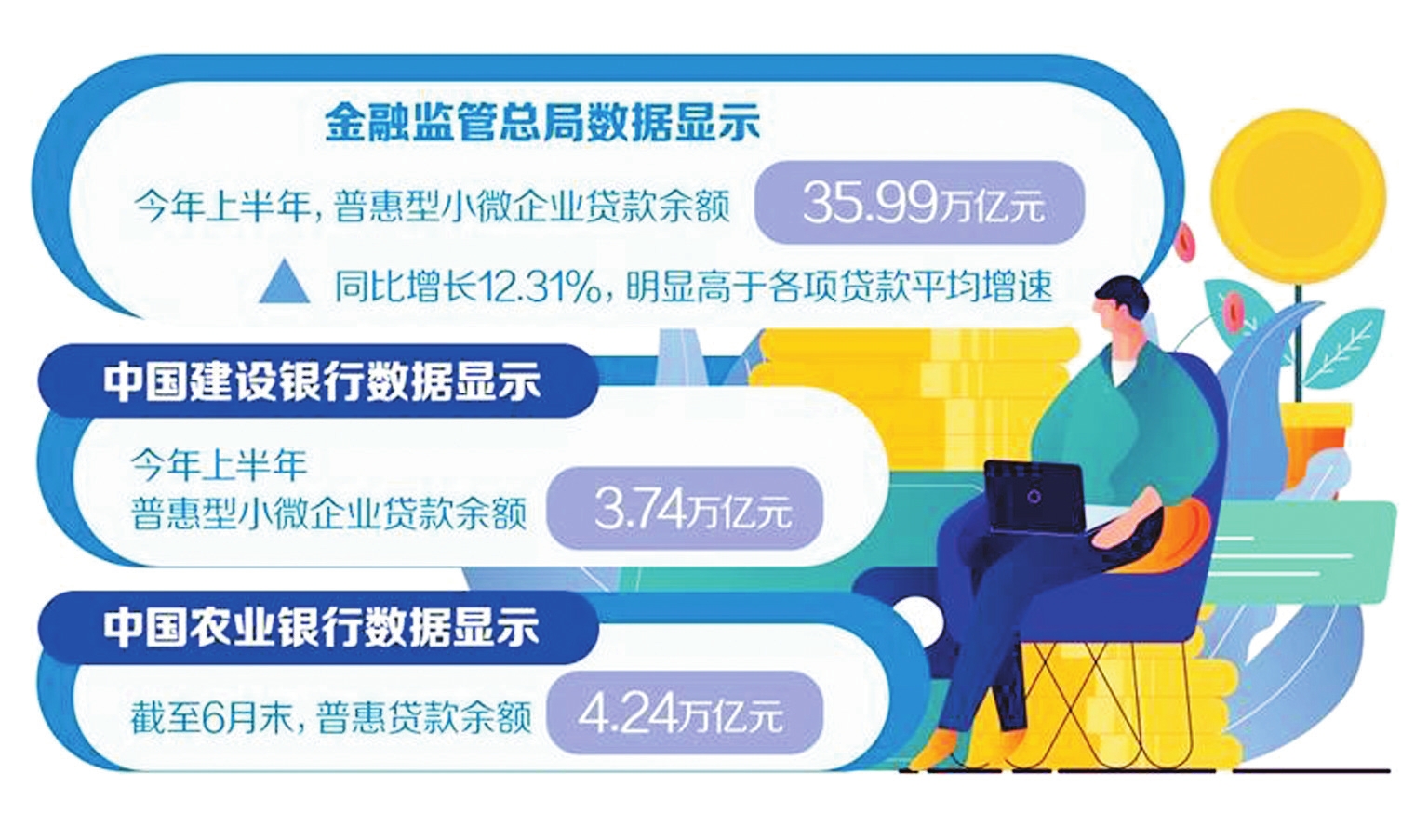 小微企業(yè)是經(jīng)濟發(fā)展的生力軍、就業(yè)的主渠道、改善民生的重要支撐。金融監(jiān)管總局統(tǒng)計數(shù)據(jù)顯示,上半年,普惠型小微企業(yè)貸款增長較快,普惠型小微企業(yè)貸款余額35.99萬億元,同比增長12.31%,明顯高于各項貸款平均增速。