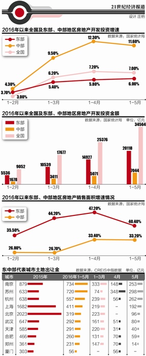 不過,整個4月,作為一線城市的北京和上海竟無一幅地塊出讓,而到了5月,北京、上海、蘇州、南京、杭州開始集中供地,僅這5個城市當月的土地出讓金就高達1101億元。作為中部城市的合肥、武漢、鄭州等地卻放慢了供地節(jié)奏,這成為導致中部地區(qū)房地產開發(fā)投資增速在5月首次調頭向下的主因。
