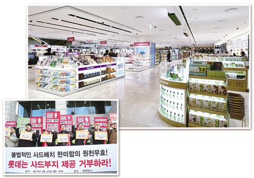 左圖 2月27日,韓國民眾在位于首爾的樂天集團(tuán)總部前舉行抗議示威活動,并高舉反對樂天出讓“薩德”用地的標(biāo)語。 新華社發(fā)