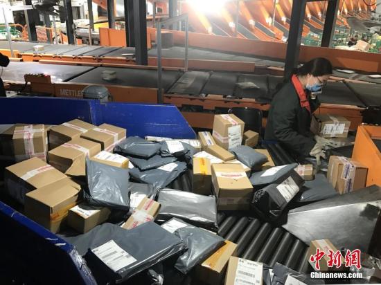 資料圖:湖南長(zhǎng)沙郵區(qū)中心局的工作人員正在處理堆積的快遞包裹。中新社記者 唐小晴 攝