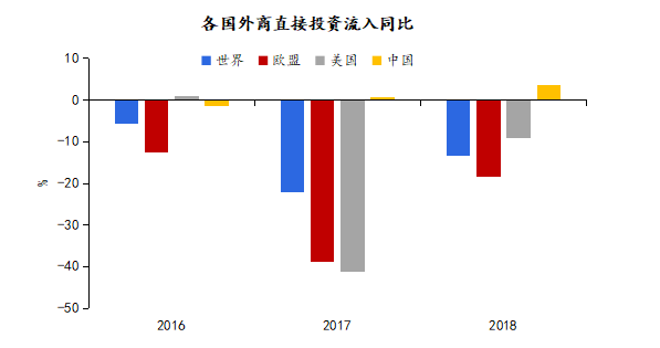 圖表3 中國(guó)吸引外商投資穩(wěn)中有升,而全球主要經(jīng)濟(jì)體均為負(fù)增長(zhǎng)