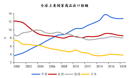 圖表1 中國(guó)商品出口占全球份額升至近13%,躍居全球第一