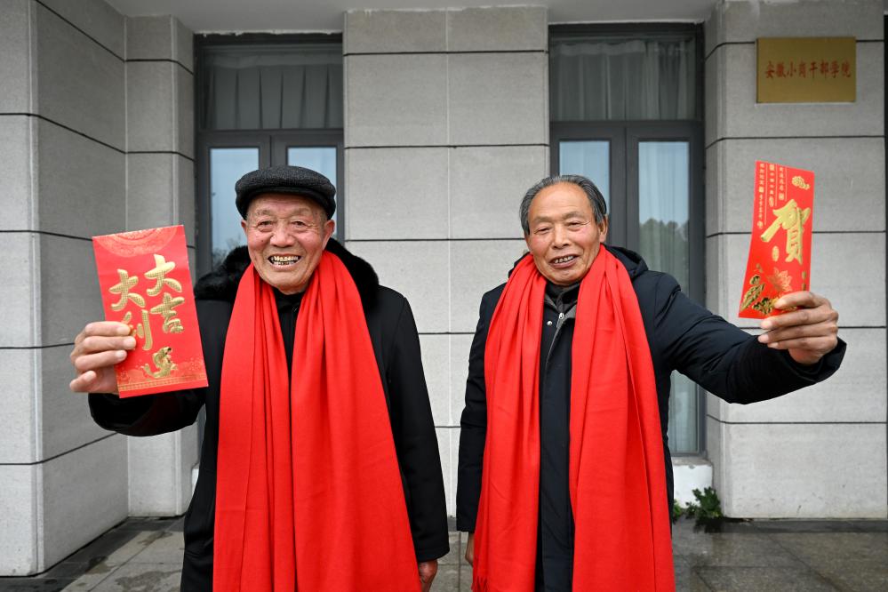 1月25日,在鳳陽縣小崗村,“大包干”帶頭人嚴金昌(左)和嚴宏昌展示自家領取的分紅紅包。新華社記者 黃博涵 攝