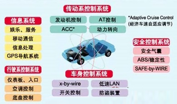 看看這張圖,你會理解電子系統(tǒng)對于每輛車的重要性,用傳感器、微處理器、執(zhí)行器、幾十甚至上百個電子元器件及其零部件組成的電控系統(tǒng)。