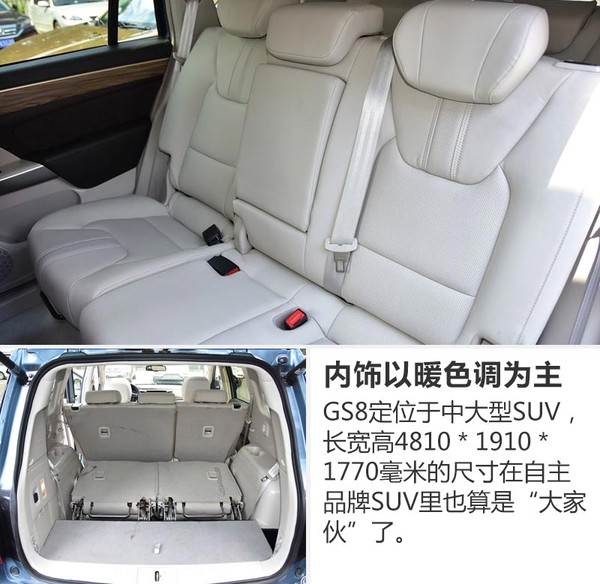 GS8的設(shè)計(jì)由原奔馳設(shè)計(jì)師張帆操刀,在內(nèi)飾部分也較為洞察國內(nèi)消費(fèi)者的喜好。車內(nèi)整體寬敞舒適,顏色采用偏暖的木色,打造一種家用溫馨感。空間方面,GS8的長寬高分別為4810*1910*1770毫米,軸距2800毫米,采用7座布局。