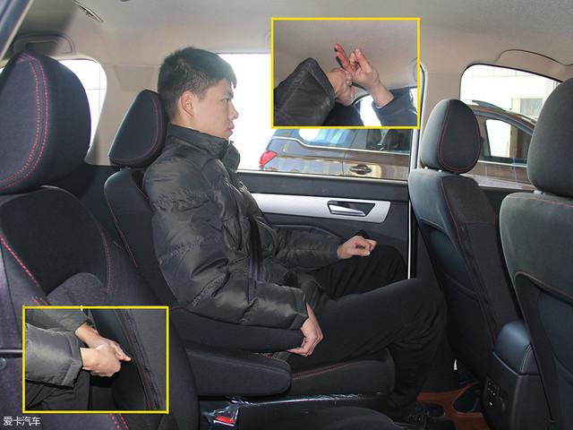 第二排為兩個獨立座椅,座椅填充和前排保持一致,乘坐感受同樣舒適,頭枕高度可調(diào)。前排座椅位置保持不變,同一位模特坐進(jìn)第二排,頭部空間剩余一拳三指,腿部空間剩余一拳兩指。