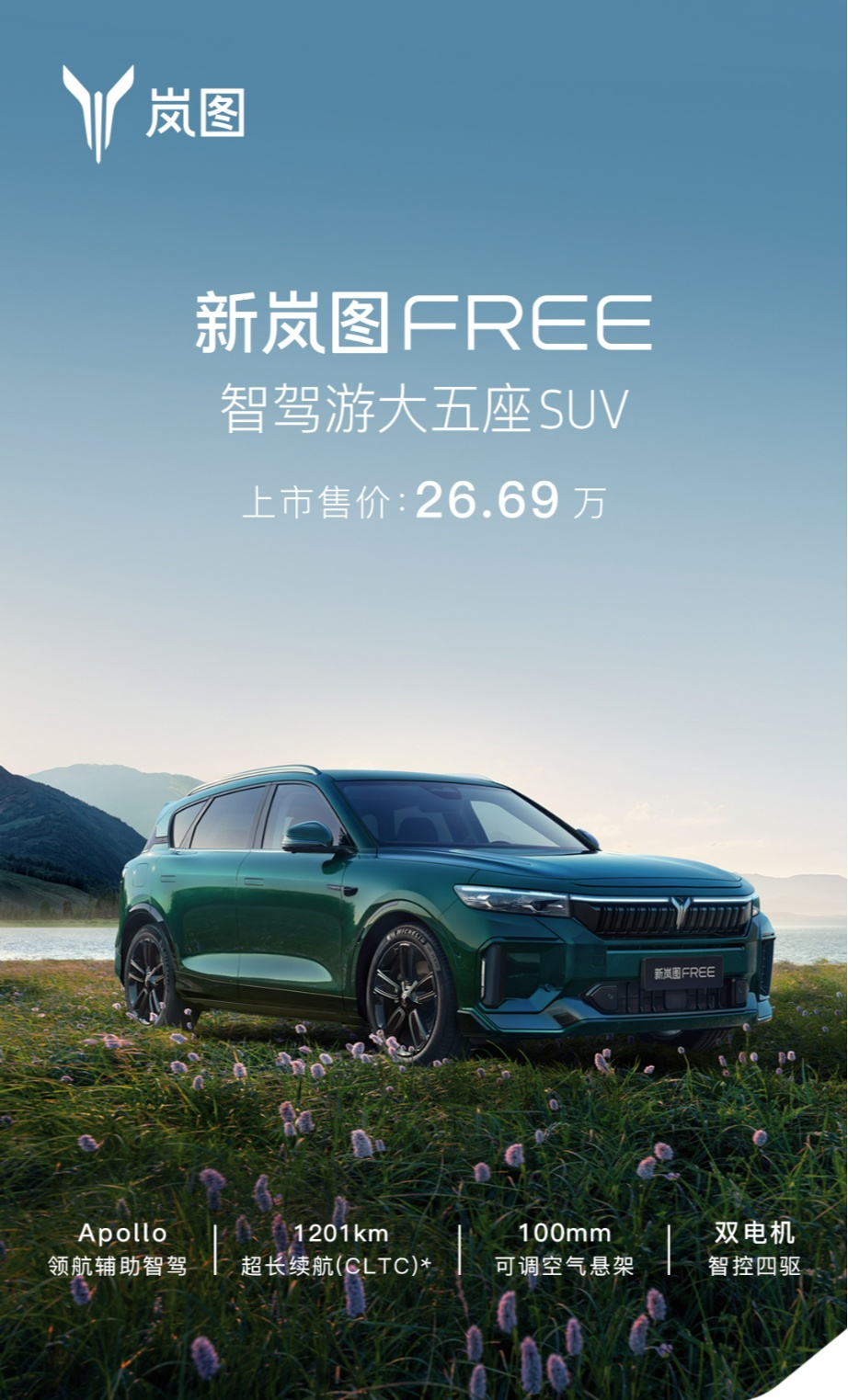 嵐圖汽車CEO盧放表示,作為“智駕游大五座SUV”,新嵐圖FREE的“智”,代表Apollo Highway Driving Pro領航輔助智駕帶來的智駕體驗;“駕”,意味著繼承了嵐圖品牌基因里的駕控實力;“游”,則是超長續(xù)航、超低能耗以及豪華配置帶來的舒適享受。新嵐圖FREE有智慧、有力量、有激情,專為追求自由的“公路旅行家”打造,嵐圖期待與廣大用戶一起,盡情釋放心中的自由,奔赴遠方,開啟人生的“智駕游”。