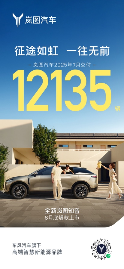 立足高質(zhì)量發(fā)展賽道,嵐圖汽車再傳捷報(bào)。8月1日,嵐圖汽車公布上月銷量數(shù)據(jù)。7月,嵐圖汽車單月交付達(dá)12135輛,同比增長102%,環(huán)比增長21%且實(shí)現(xiàn)六連漲;1-7月,嵐圖汽車?yán)塾?jì)銷量達(dá)68263輛,同比增長88%。在高端新能源MPV領(lǐng)域,爆款嵐圖夢想家站穩(wěn)冠軍。上市半個(gè)月,嵐圖FREE+就躋身30萬級混動(dòng)SUV市場TOP3。產(chǎn)品力度與市場熱度雙向奔赴,嵐圖旗下“雙爆款”態(tài)勢已然形成。