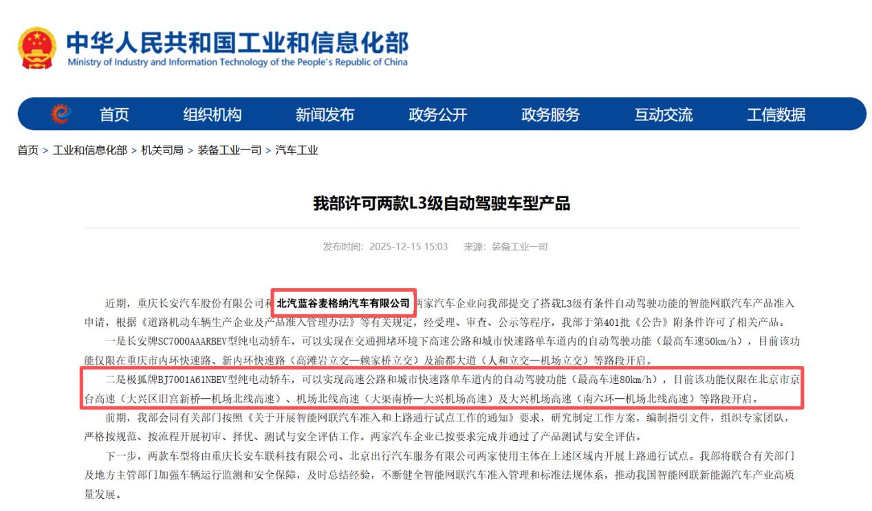 12月15日,北汽集團旗下極狐阿爾法S(L3版)正式獲批工業(yè)和信息化部自動駕駛車型產品準入許可,即將在北京市限定區(qū)域內開展L3級有條件自動駕駛上路通行試點。這標志著我國自動駕駛技術發(fā)展逐步走向量產應用階段,也是北汽集團在自動駕駛領域從技術驗證階段邁向量產應用階段的重要里程碑。