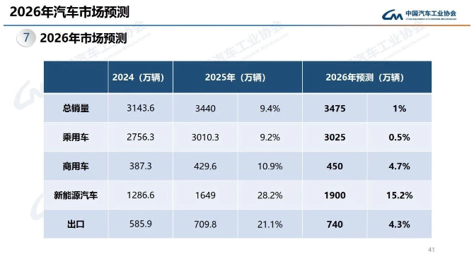 與此同時,中汽協(xié)對2026年汽車市場進(jìn)行了預(yù)測。2026年,預(yù)計國產(chǎn)汽車總銷量將達(dá)到3475萬輛,微增1%。其中,乘用車預(yù)計為3025萬輛,微增0.5%;商用車預(yù)計為450萬輛,小幅增長4.7%;新能源汽車預(yù)計為1900萬輛,增長15.2%;汽車出口量預(yù)計為740萬輛,小幅增長4.3%。