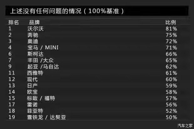 Bild調(diào)查的車身品質(zhì)(接縫)主要包括車身品質(zhì)、開(kāi)關(guān)門的手感、鋼板接縫及經(jīng)常與身體接觸的地方。沒(méi)錯(cuò),這一單項(xiàng)表現(xiàn)最佳的是沃爾沃,得分為2分。這里小編要敲黑板提醒大家注意了:在車身品質(zhì)(接縫)滿意度上,得分最低表現(xiàn)最好。當(dāng)然,斯柯達(dá)也得到了2分,寶馬、奔馳則同為3分。而得分最高的就是前面提到的達(dá)契亞,它的得分是12分,換句話說(shuō)就是達(dá)契亞是車身品質(zhì)滿意度最低的品牌。有意思的是與達(dá)契亞一起墊底是法系品牌雷諾,它的得分是11分。