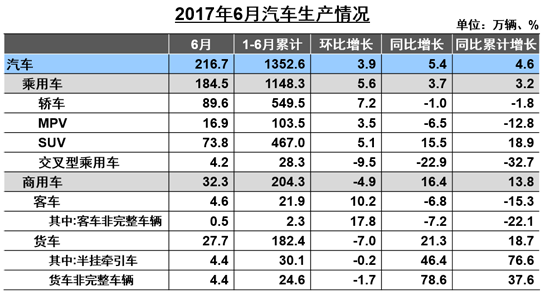 6月,我國汽車產(chǎn)銷分別為216.7萬輛和217.2萬輛,環(huán)比分別增長3.9%和3.6%,同比分別增長5.4%和4.5%。上半年,我國汽車產(chǎn)銷分別為1352.6萬輛和1335.4萬輛,比上年同期分別增長4.6%和3.8%,低于上年同期1.9和4.3個(gè)百分點(diǎn)。