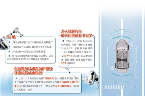 當(dāng)前,L1和L2級別半自動駕駛已經(jīng)大規(guī)模量產(chǎn);L3級將在今年落地,明年會有更多應(yīng)用;L4級也有一些龍頭企業(yè)在積極探索。但是,針對“2030年左右就可實現(xiàn)無人駕駛產(chǎn)業(yè)化”的預(yù)測,專家則持謹慎態(tài)度。要真正實現(xiàn)完全意義上的無人駕駛,還面臨著安全、成本等一系列難題,需要產(chǎn)業(yè)界和全社會合力推動解決。