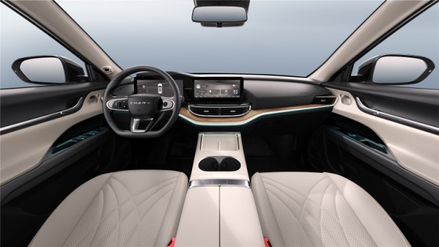 奇瑞eQ7車內T型布局設計簡約且富有科技感,貫穿中控臺的線條具有一定層次感,并會有氛圍燈進行點綴。另外,eQ7在中央扶手箱前方有兩個水杯槽,預計配備了雙手機無線充電面板,下方還有容量不錯的儲物槽。