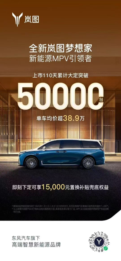 展望未來,嵐圖汽車CEO盧放表示:“2025年將推出4款以上全新或改款車,以更加完善的SUV、轎車和MPV產(chǎn)品布局,進(jìn)一步滿足廣大用戶的個(gè)性化需求。全新嵐圖夢(mèng)想家將以領(lǐng)先一代的產(chǎn)品力,成為絕對(duì)爆款,夯實(shí)‘頂流’地位,同時(shí)嵐圖繼續(xù)打造更多爆款,全力沖刺全年20萬輛的銷量目標(biāo),為更多用戶提供持續(xù)、穩(wěn)定、靠譜的產(chǎn)品和服務(wù)。”