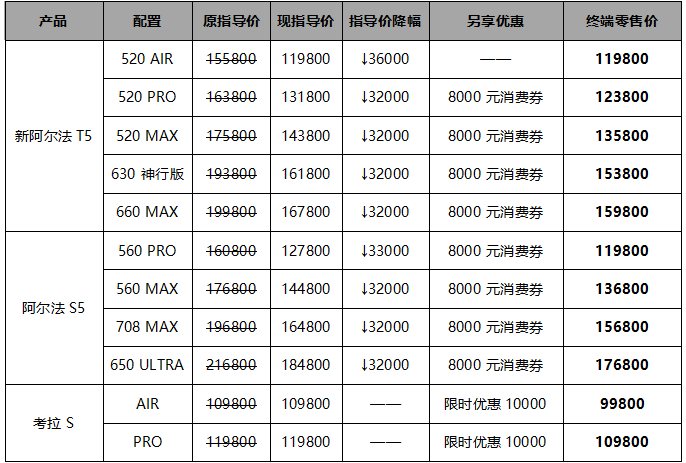 即日起,極狐對(duì)新阿爾法T5和阿爾法S5官方指導(dǎo)價(jià)進(jìn)行下調(diào),官方降價(jià)32000元,還可另享8000元消費(fèi)券,如此一來(lái),5系“雙子星”終端零售價(jià)最低僅需11.98萬(wàn)元;考拉S限時(shí)優(yōu)惠增至10000元,終端零售價(jià)直接下探到了9.98萬(wàn)元起。