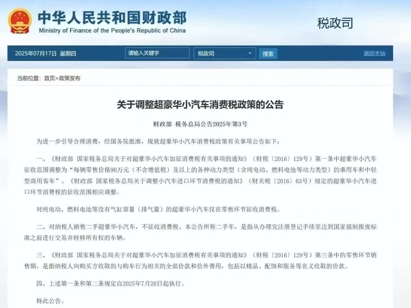 央廣網北京消息(記者董楠)7月17日,財政部、稅務總局聯(lián)合發(fā)布公告,對超豪華小汽車消費稅政策作出調整。此次調整不僅將征稅門檻從130萬元(不含增值稅)降至90萬元,還在征稅環(huán)節(jié)、車型差異、二手車交易等方面做出明確規(guī)范,新政7月20日起正式執(zhí)行。這是2016年我國對超豪華小汽車加征消費稅后的首次調整。