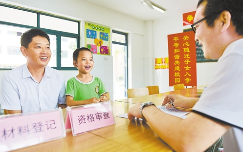 在安徽合肥市和平小學(xué)花沖分校報(bào)名點(diǎn),畢權(quán)航和父親畢金倉(cāng)(左)在辦理報(bào)名入學(xué)相關(guān)手續(xù)(2017年7月12日攝)。合肥市瑤海區(qū)進(jìn)城務(wù)工人員隨遷子女入學(xué)報(bào)名工作啟動(dòng)后,該區(qū)教育部門在各定點(diǎn)學(xué)校設(shè)置“隨遷子女入學(xué)幫你辦”窗口,安排工作人員協(xié)助辦理,同時(shí)設(shè)置家長(zhǎng)意見(jiàn)箱,監(jiān)督入學(xué)辦理的全過(guò)程。 新華社記者 張 端攝
