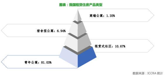 報告指出,我國租賃住房類型整體呈現(xiàn)出明顯的“正金字塔”形態(tài):滿足年輕人需求的青年公寓占比最大,超過80%;其次是滿足新市民需求的租賃式社區(qū),占比超過10%;面對企業(yè)基層員工的宿舍型公寓占比8.62%;服務式公寓比例僅為1.35%。