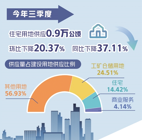 中國國土勘測規(guī)劃院新近發(fā)布的全國主要城市地價監(jiān)測報告顯示,三季度住宅用地供應(yīng)0.9萬公頃,環(huán)比下降20.37%,同比下降37.11%,住宅用地供應(yīng)同比增速為2015年以來單季最低。