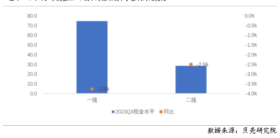 圖8 2023年三季度重點40城不同能級城市租金及同比變化