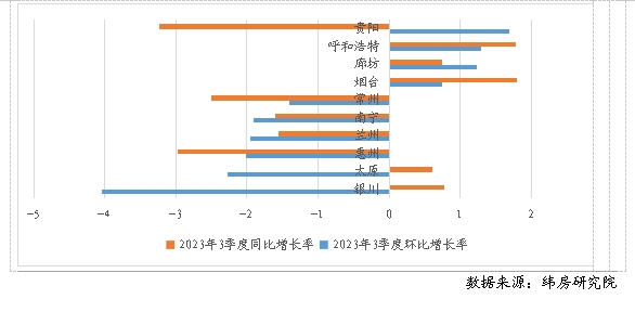 緯房研究院數(shù)據(jù)顯示,重點40城中,僅有10個城市住房租金環(huán)比上升,其余30個城市住房租金均環(huán)比下降。其中,租金上漲的城市增幅也并不可觀,環(huán)比增長率大多不到1%。租金下跌的30城中,12個城市租金跌幅在1%以內(nèi),12個城市跌幅在1%-2%之間,6個城市跌幅超過2%。與2022年三季度末相比,重點40城中16個城市住房租金同比上漲,24個城市同比下降。其中,3個城市同比增長超過2%,13個城市同比漲幅在2%以內(nèi),12個城市同比跌幅在2%以內(nèi),11個城市同比跌幅在2%-4%之間,1個城市同比跌幅超過4%。