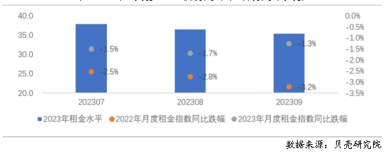 圖6 2023年三季度重點40城月度租金水平及月度租金指數(shù)變化