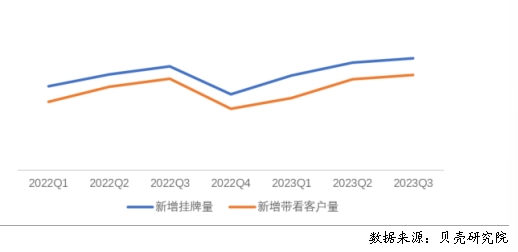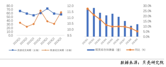 根據(jù)貝殼研究院數(shù)據(jù),全國重點40城三季度房客源成交周期分別為56.7、11.5天,房源成交周期環(huán)比減少2.1天,同比增加2.7天;客源成交周期環(huán)比延長1天,同比延長1天。隨著個人租賃房源供應的增加,疊加保障性租賃住房、市場化集中式租賃房源的增加,個人業(yè)主出租房源出租速度減緩。從庫存房源來看,今年1-9月租賃庫存房源量均呈現(xiàn)同比增加的趨勢,與此同時,租客租房面臨的選擇項增多,租客對于租賃房源可選類型和房源量均有增加。