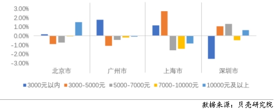 貝殼研究院數(shù)據(jù)顯示,一線城市呈現(xiàn)不同程度的重心下移,同時北京、深圳還呈現(xiàn)出延遲購房“購轉租”的特征,高套均支出區(qū)間的租賃房源成交增加。上海和廣州租賃重心下移態(tài)勢明顯。上海套均租金5000元以內(nèi)的成交占比增加了將近4個百分點,5000元以上的占比均呈現(xiàn)減少趨勢,尤其是套均租金在5000-10000元區(qū)間的房源占比;廣州套均租金在3000元以內(nèi)的增加了1.8個百分點,3000元以上的均呈現(xiàn)減少趨勢。